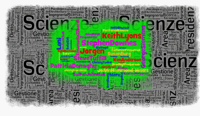 The background of the picture is composed putting in Wordle the index of my university’s site, institutes, departments, services, labels. Closed boxes, the people inside, closed. We talked about the role of openness in education in this course; there are books on the role of openness, even on the management of companies, nowadays. The university here is desperately closed and static, at all levels.