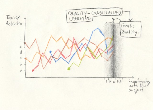 The idea here is to forget about time and focus on a sort of quality constrain. Students wander through the topics/activities suggested by the teacher who is available to help and give advices.