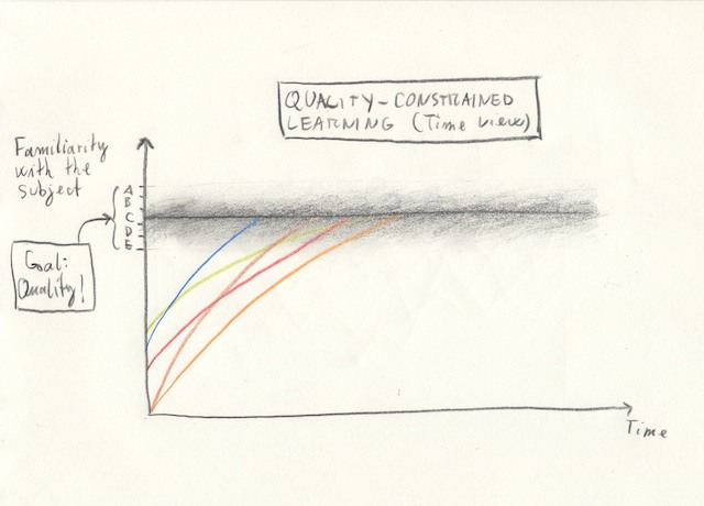 Everyone has its own time, that’s why I’ve dropped the time constrain. If you require more time to achieve the minimum required familiarity with the subject, it does not means that you are worse than others, it simply means that this is the time you need given all the other activities and problems (may be headache …?) you may have in your life. These contingecies should not hamper the quality of your learning.