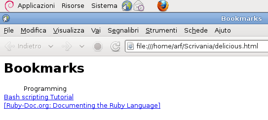 Il formato html è standard. Lo potete aprire cercando il file con un browser internet qualunque. Ecco, qui sotto vi mostro come appare il file che ho salvato stamani, più precisamente una copia nella quale ho lasciato solo due bookmark a titolo esemplificativo.