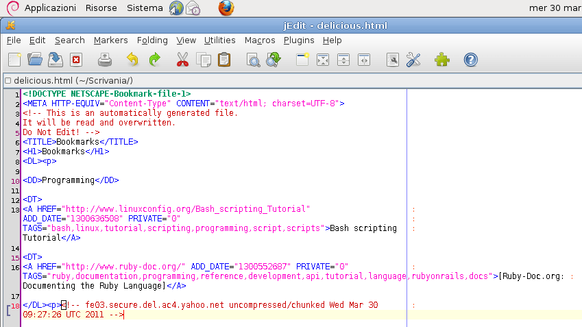 Se lo guardate con un minimo di curiosità vi renderete facilmente conto del significato dei codici e del tipo di informazioni che vi sono dentro. I bookmark sono rappresentati come una semplice lista. Potete vedere la documentazione sulle liste html di w3schools.com per orientarvi rapidamente.