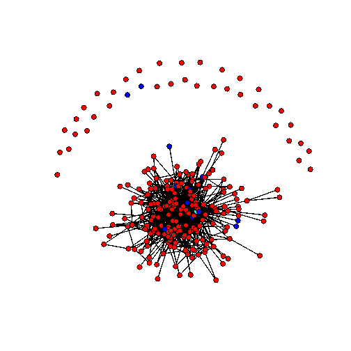 Sociogramma 4 maggio 2011. I nodi rossi sono studenti di medicina, i nodi blu cyberstudenti, il nodo celeste è il docente. Una linea che congiunge due nodi significa che almeno uno dei due ha fatto almeno un commento ad un post dell’altro.