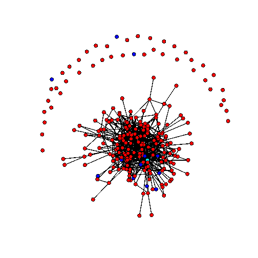 Sociogramma 29 marzo 2011. I nodi rossi sono studenti di medicina, i nodi blu cyberstudenti, il nodo celeste è il docente. Una linea che congiunge due nodi significa che almeno uno dei due ha fatto almeno un commento ad un post dell’altro.