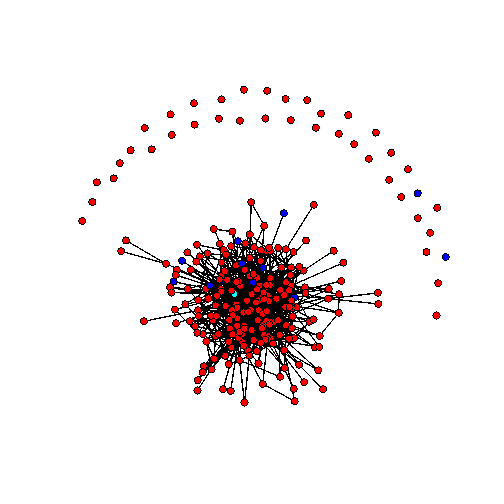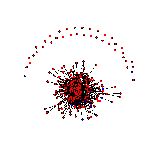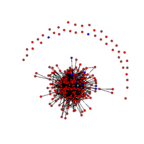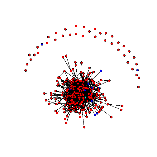 Sociogramma 3 giugno 2011. I nodi rossi sono studenti di medicina, i nodi blu cyberstudenti, il nodo celeste è il docente. Una linea che congiunge due nodi significa che almeno uno dei due ha fatto almeno un commento ad un post dell’altro