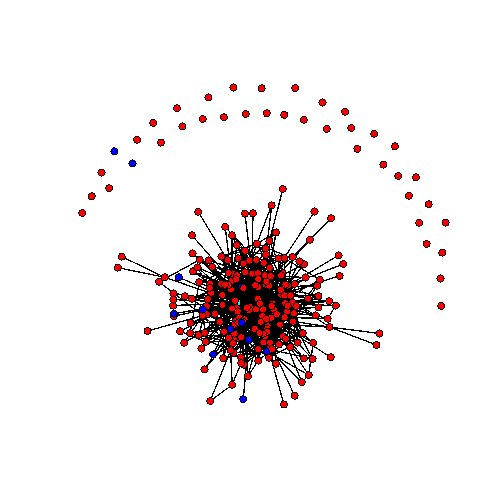 Sociogramma 7 giugno 2011. I nodi rossi sono studenti di medicina, i nodi blu cyberstudenti, il nodo celeste è il docente. Una linea che congiunge due nodi significa che almeno uno dei due ha fatto almeno un commento ad un post dell’altro.No, non sei andato fuori tema, Andrea.
