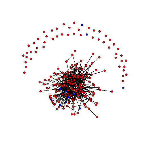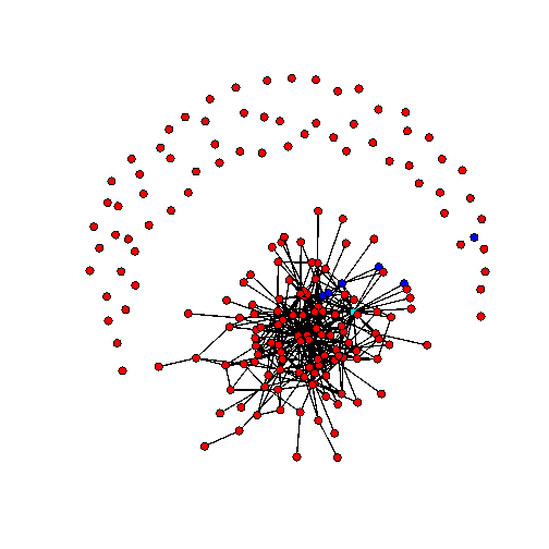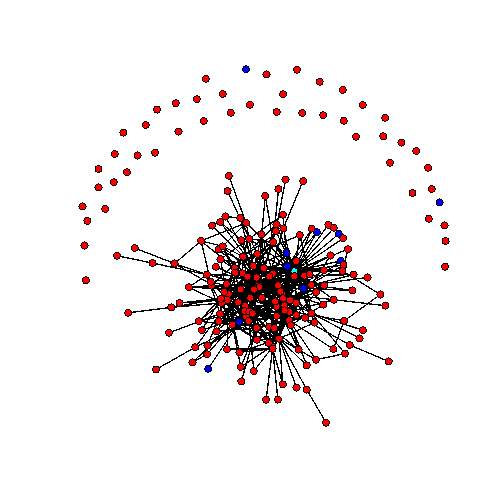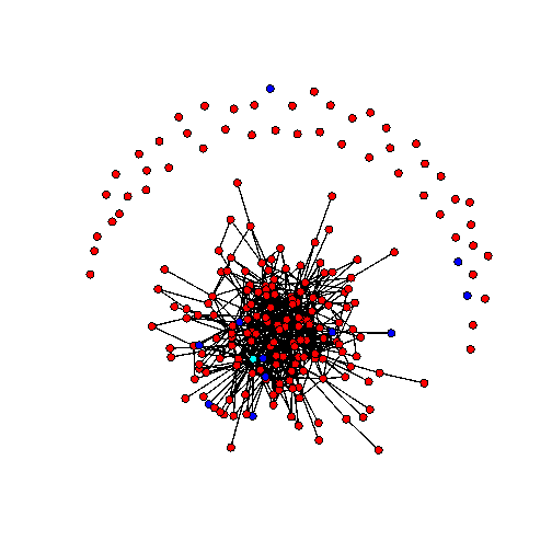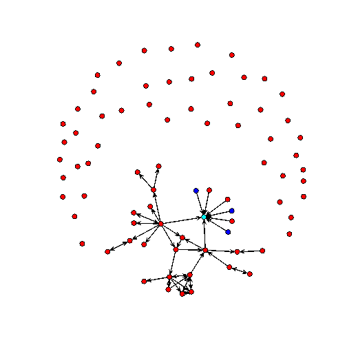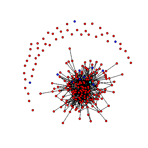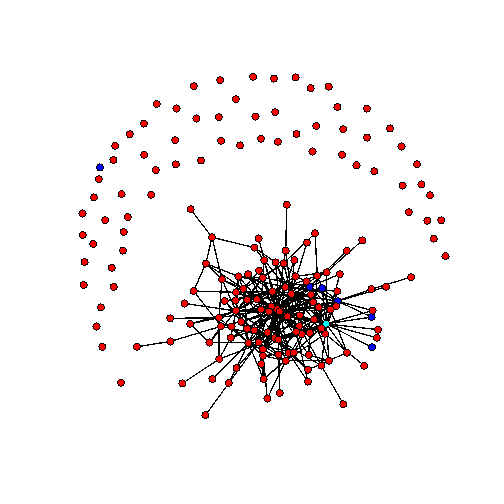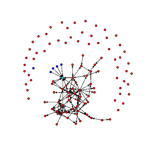 - Sociogramma 12 marzo 2010. I nodi rossi sono studenti di medicina, i nodi blu cyberstudenti, il nodo celeste è il docente. Una freccia che va dal nodo A al nodo B significa che A ha fatto un commento a B, e viceversa.